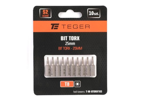 Bit torx 25 mm/t8 (zestaw 10 szt) / teger przeznaczony do odkręcania i dokręcania wkrętów i śrub z końcówką typu torx. Wykonany ze stali s2 o podwyższonej twardości, odpornej na skręcanie. Precyzyjnie wykonana i namagnesowana końcówka bita zapobiega wypadaniu wkręta, co znacząco ułatwia pracę.