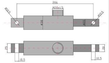 Parametry techniczne: długość minimalna: 206 mm gwinty do podłączenia: m20.15 średnica otworów łożysk mocujących: 10.5/10.5 mm średnica tłoczyska: 21 mm średnica zewnętrzna cylindra: 38 mm szerokość główki: 25/20 mm