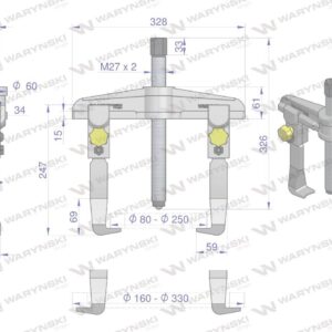 Ściągacz 160 x 330mm do łożysk lub tulei, dwuramienny, typ t, odwracalne ramiona o możliwym dwustronnym podbieraniu łożysk. Zewnętrznie pasujący do średnic 160-330mm, wewnętrznie pasuje do średnic 80-250mm waryński
