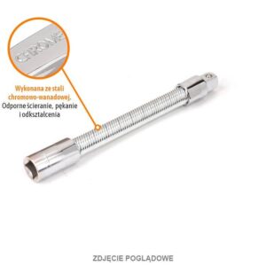 Przedłużka do nasadek 1/2″ giętka 200 mm / teger przeznaczona do zwiększenia zasięgu pracy przy użyciu klucza nasadowego, elastyczna konstrukcja umożliwia pracę pod dużym kontem. Wykonana ze stopu stali chromowo-wanadowej crv, wytrzymałej na naprężenie statyczne i kinetyczne. Wysoka jakość wykonania, unikalna, polerowana powłoka na powierzchni klucza znacząco zwiększa komfort pracy oraz pozwala na utrzymanie narzędzi w czystości.