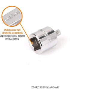 Redukcja f 1/4″-m 1/2″ / teger umożliwiająca współpracę grzechotki i nasadki o różnych wymiarach. Wykonana ze stopu stali chromowo-wanadowej crv, wytrzymałej na naprężenie statyczne i kinetyczne. Wysoka jakość wykonania, trwałość i niezawodność w każdych warunkach, unikalna, polerowana powłoka na powierzchni klucza znacząco zwiększa komfort pracy oraz pozwala na utrzymanie narzędzi w czystości.