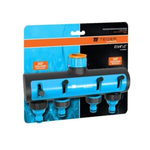 Przyłącze rozdzielające do kranu – 4 kierunkowe / teger przeznaczone do jednoczesne podłączenie czterech urządzeń do jednego kranu. Przepływ wody można płynnie regulować dla każdego wyjścia oddzielnie. Zawory z czytelnymi oznaczeniami otwarcia i zamknięcia pozwalają na intuicyjną i płynną regulację przepływu wody. Rozdzielacz posiada dwa zewnętrzne przyłącza mocowane na obrotowej głowicy 360 stopni, co umożliwia podłączenie dodatkowych akcesoriów nawadniających pod zmiennym kontem.
