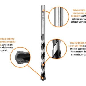 Wiertło do betonu widiowe – pro super bas marki teger / wykonane wg normy din 8039 niezwykle trwałe, twarde, przeznaczone do wiercenia w materiałach o dużej gęstości, a dzięki zastosowaniu węglika spiekanego wiertło zachowuje swoje właściwości skrawające przez długi czas. Rdzeń wiertła dodatkowo wzmocniony wolframem i kobaltem zabezpiecza narzędzie przed pęknięciami występującymi podczas wiercenia udarowego.
