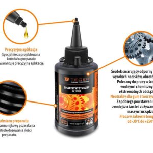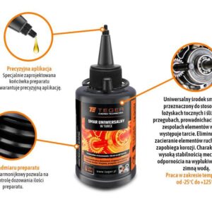 Smar uniwersalny w tubce 70 ml / teger to uniwersalny środek smarujący przeznaczony do stosowania w łożyskach tocznych i ślizgowych, przegubach, prowadnichach oraz innych zespołach elementów w których występuje tarcie. Eliminuje tarcie i zacieranie elementów ruchomych oraz zapobiega korozji. Charakteryzuje się wysoką stabilnością mechaniczną i odpornościa na wypłukiwanie słoną, zimną wodą. Wykorzystywany do smarowania elementów mechanicznych, piast rowerów, samochodów, zawiasów, zamków, gwintów, szyn itp. Praca w zakresie temperatur od -25°c do +125°c.