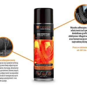 Smar syntetyczny do łańcuchów i lin z grafitem 500ml / teger wysoko adhezyjny smar o dużych właściwościach penetrujących z dodatkiem grafitu. Zapewnia efektywne i długotrwałe smarowanie oraz konserwację wnikając nawet w najtrudniej dostępne miejsca. Długotrwale łączy się z powierzchnią tworząc cienką warstwę odporną na zużycie, utlenianie, korozję, działanie słonej wody, czy promieni słonecznych. Wykazuje dużą odporność na wysokie ciśnienia, a w niskich temperaturach zachowuje swoją sprężystość i nie kruszeje. Nie zawiera silikonu oraz związków aox. Nie zawiera smarów stałych. Idealny do zastosowań przy smarowaniu oraz konserwacji lin metalowych, wciągarek, wind, przenośników, wyciągów, lin do podnoszenia ciężarów, wszelkiego rodzaju łańcuchów transportowych lub napędowych, elementach przeniesienia napędów, przy smarowaniu łańcuchów wózków widłowych. Przeznaczony do smarowania elementów w przemyśle motoryzacyjnym, hutniczym, stoczniowym, wydobywczym, chemicznym, drzewnym i poligraficznym. Praca w zakresie temperatur od -30°c do +200°c. Sposób użycia: pojemnik przed użyciem wstrząsnąć. Rozpylać z odległości 20-30 cm. Magazynowanie: pojemnik pod ciśnieniem, chronić przed promieniami słonecznymi i temperaturą powyżej 50 °c.