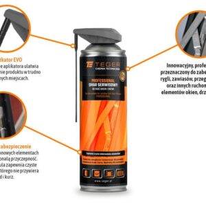 Smar serwisowy do okuć okien i drzwi professional z aplikatorem evo 500 ml / teger innowacyjny, profesjonalny smar przeznaczony do zabezpieczenia okuć, rygli, zawiasów, przegubów, prowadnic oraz innych ruchomych zespołów elementów okien, drzwi, furtek i bram. Dzięki zastosowaniu specjalnej formuły zapewnia czyste smarowanie do którego nie przywiera brud i kurz. Nie spływa po pionowych elementach wykazując doskonałą przyczepność. Konserwuje i zabezpiecza każdy element systemów okiennych i drzwiowych zapewniając prawidłową i płynną pracę. Preparat w pełni bezpieczny dla gumy, uszczelek i tworzyw sztucznych. Sposób użycia: pojemnik przed użyciem wstrząsnąć. Rozpylać niewielką ilość bezpośrednio na elementy ruchome. Smarowanie należy przeprowadzać w przypadku stwierdzenia zużycia lub zanieczyszczenia smaru. Aplikator evo dociera w trudno dostępne miejsca i gwarantuje precyzyjną aplikację. Magazynowanie: pojemnik pod ciśnieniem, chronić przed promieniami słonecznymi i temperaturą powyżej 50 °c.