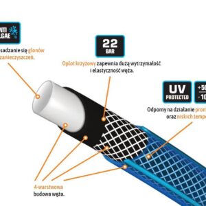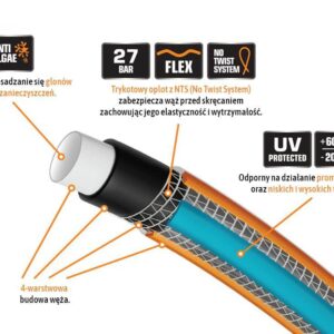 Wąż ogrodowy „professional- nts extra flex” / 4-warstwowy wąż wykonany z elastycznego pvc, wzmocniony przędzą poliestrową w oplocie trykotowym która jeszcze skuteczniej zabezpiecza przed zmianą parametrów technicznych węża oraz zwiększa wytrzymałość na ciśnienia.