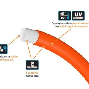 Wąż ogrodowy – tłoczny do pomp zanurzeniowych fi 6/4″, 10m / teger / przeznaczony do tłoczenia wody i ścieków o ciśnieniu roboczym nie większym niż 1 bar. Wykonany z elastycznego pcw w kolorze pomarańczowym na bazie suspensyjnego polichlorku winylu, tereftalanu, kauczuku syntetycznego oraz innych komponentów, posiadający szerokie zastosowanie w przemyśle, rolnictwie i ogrodnictwie. Nie zawierający kadmu i ołowiu, wysoce elastyczny, odporny na działanie kwasów i zasad, promieni uv oraz niskich temperatur. Zakres temperatur od -25°c do +60°c.