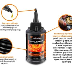 Wazelina techniczna w tubce 70 ml / teger niskotopliwy i wysoce lepki środek smarny do zabezpieczania elementów przed czynnikami atmosferycznymi i konserwacji łożysk, elementów metalowych, plastikowych i gumowych. Przeznaczony do smarowania elementów lekko obciążonych: zamki, kłódki, zawiasy, narzędzia i różnego rodzaju maszyny, zabezpiecza przed sklejaniem i przymarzaniem uszczelek gumowych, zabezpiecza i natłuszcza wyroby skórzane, chroni przed korozją elementy i powierzchnie metalowe, konserwuje styki elektryczne.
