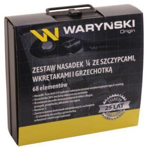 Zestaw nasadek w kasecie metalowej. 68 el. Waryński z nasadkami, szczypcami, wkrętakami i grzechotką