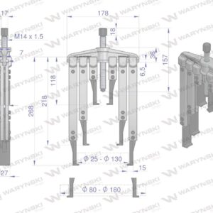 Ściągacz typu t 80-180mm do demontażu łożysk. Ma wymienne, przedłużone ramiona o długościach 100, 200 i 250mm. Zakres robocze zewnętrzne 80-180mm, wewnętrzne 25-130mm waryński