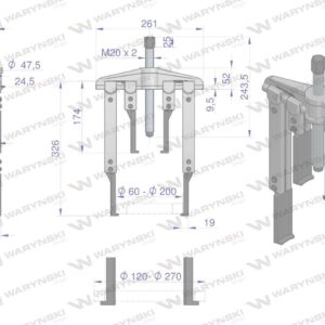 Ściągacz typu t 120-270mm do demontażu łożysk. Ma wymienne, przedłużone ramiona o długościach 150, 300. Zakres robocze zewnętrzne 120-270mm, wewnętrzne 60-200mm waryński