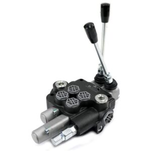 Rozdzielacz hydrauliczny 2-sekcyjny 80l sterowany joystickiem na linkę voima – monoblokowy z układem równoległym z neutralną pozycją środkową. Olej w pozycji neutralnej krąży między pompą hydrauliczną a zbiornikiem.