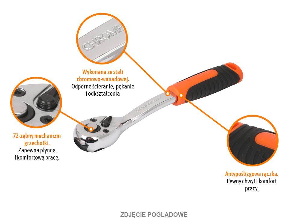 Grzechotka 1/4″ 72t / teger przeznaczona do odkręcania i dokręcania śrub przy użyciu klucza nasadowego. Wykonana ze stopu stali chromowo-wanadowej crv, wytrzymałej na naprężenie statyczne i kinetyczne. Wysoka jakość wykonania, rękojeść wykonana z antypoślizgowego tworzywa, unikalna, polerowana powłoka na powierzchni klucza znacząco zwiększa komfort pracy oraz pozwala na utrzymanie narzędzi w czystości a odgięty kształt zapewnia dostęp do trudno dostępnych miejsc. Grzechotka posiada mechanizm zapadkowy z 72 zębami oraz system blokujący klucz nasadowy wraz przyciskiem zwalniającym blokadę. Zalety klucza: bardzo mocna i wytrzymała konstrukcja, wyprofilowany uchwyt pokryty antypoślizgową gumą, precyzyjny mechanizm zapadkowy.