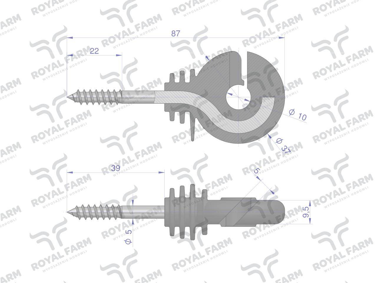 Izolator okrągły z wkrętem fi 5 do drewna z zatopionym trzpieniem wygiętym royal farm 25szt