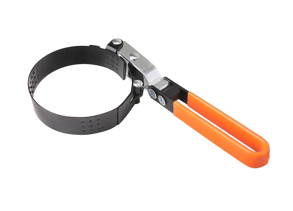 odkręcania elementów w pojazdach maszynach i przemyśle o średnicy minimalnej 73mm. Przeznaczony do pracy przy filtrach samochodowych, motocyklowych, ciągnikowych oraz innych elementach wkręcanych również o nieregularnych kształtach. Dodatkowe wypustki/perforacja na obejmie klucza zwiększają przyczepność i zapobiegają ślizganiu się klucza podczas odkręcania a przegub i mechanizm zaciskowy umożliwiają pracę jak grzechotką. Wysoka jakość wykonania, gumowa rękojeść klucza znacząco zwiększa komfort pracy oraz pozwala na utrzymanie narzędzi w czystości.
