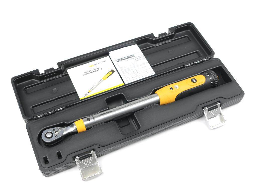 Klucz dynamometryczny rozmiar 1/2 cala zakres ustawień 40-200nm odczyt skali w wizjerze powiększającym długość 517mm zapakowany w odporne na uszkodzenia etui z tworzywa. Waryński