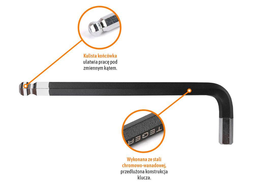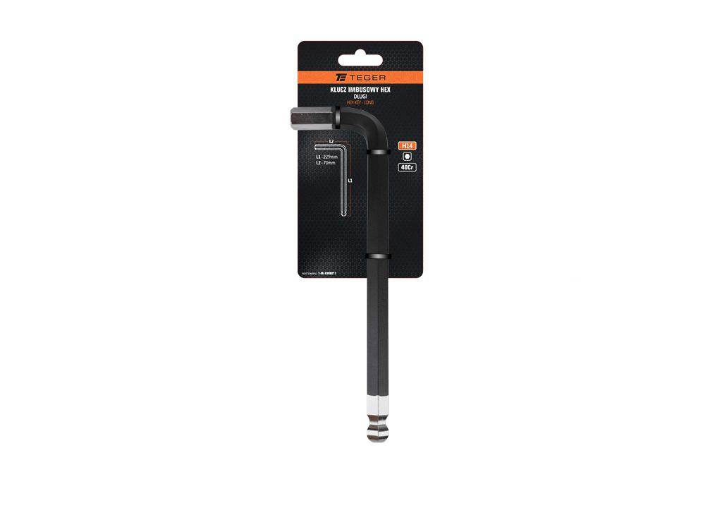 Klucz imbusowy hex h14 – długi / teger przeznaczony do odkręcania i dokręcania śrub z gniazdami typu hex. Wytrzymały dobrze wyprofilowany, sześciokątny długi klucz imbusowy z kulistą końcówką umożliwia pracę pod kątem nawet w trudno dostępnych miejscach. Wykonany z najwyższej jakości stali chromowo-wanadowej crv wytrzymałej na naprężenie statyczne i kinetyczne. Wysoka jakość wykonania, unikalna, czarna powłoka na powierzchni klucza znacząco zwiększa komfort pracy oraz pozwala na utrzymanie narzędzi w czystości.