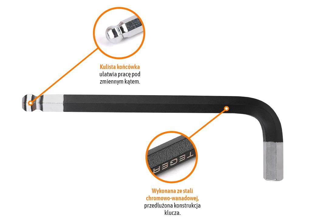 Klucz imbusowy hex h19 – długi / teger przeznaczony do odkręcania i dokręcania śrub z gniazdami typu hex. Wytrzymały dobrze wyprofilowany, sześciokątny długi klucz imbusowy z kulistą końcówką umożliwia pracę pod kątem nawet w trudno dostępnych miejscach. Wykonany z najwyższej jakości stali chromowo-wanadowej crv wytrzymałej na naprężenie statyczne i kinetyczne. Wysoka jakość wykonania, unikalna, czarna powłoka na powierzchni klucza znacząco zwiększa komfort pracy oraz pozwala na utrzymanie narzędzi w czystości.
