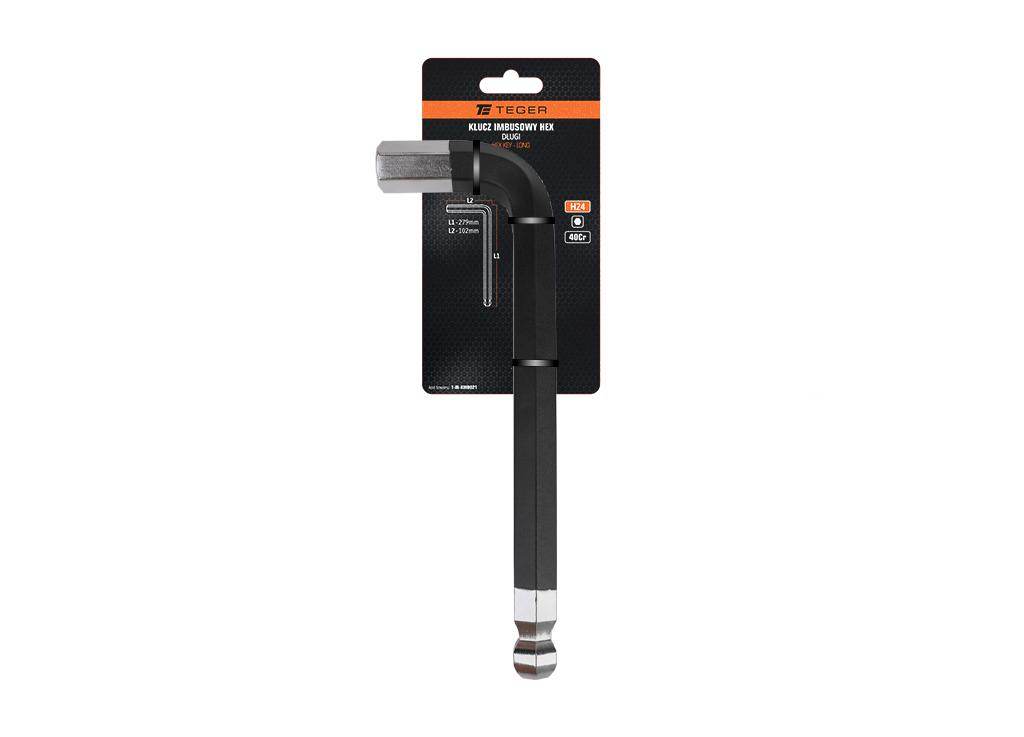 Klucz imbusowy hex h24 – długi / teger przeznaczony do odkręcania i dokręcania śrub z gniazdami typu hex. Wytrzymały dobrze wyprofilowany, sześciokątny długi klucz imbusowy z kulistą końcówką umożliwia pracę pod kątem nawet w trudno dostępnych miejscach. Wykonany z najwyższej jakości stali chromowo-wanadowej crv wytrzymałej na naprężenie statyczne i kinetyczne. Wysoka jakość wykonania, unikalna, czarna powłoka na powierzchni klucza znacząco zwiększa komfort pracy oraz pozwala na utrzymanie narzędzi w czystości.