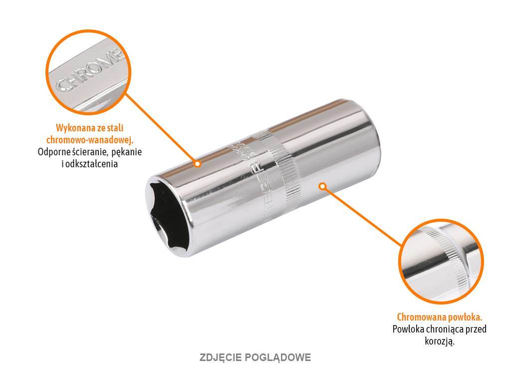 Klucz nasadowy 1/2″ sześciokątny 16 mm – do świec / teger nasadka przeznaczona do odkręcania i dokręcania świec. Wykonana ze stopu stali chromowo-wanadowej crv, wytrzymałej na naprężenie statyczne i kinetyczne. Wysoka jakość wykonania, trwałość i niezawodność w każdych warunkach, unikalna, polerowana powłoka na powierzchni klucza znacząco zwiększa komfort pracy oraz pozwala na utrzymanie narzędzi w czystości.