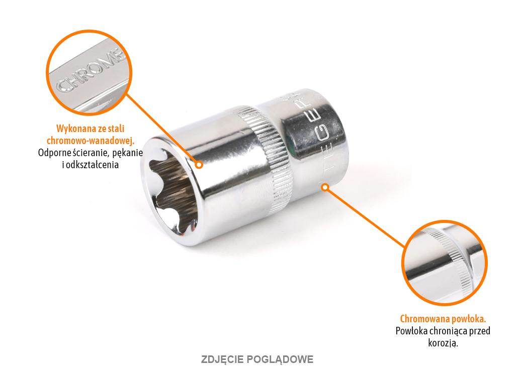 Klucz nasadowy 1/2″ torx e24 / teger nasadka przeznaczona do odkręcania i dokręcania śrub i nakrętek typu torx. Wykonana ze stopu stali chromowo-wanadowej crv, wytrzymałej na naprężenie statyczne i kinetyczne. Wysoka jakość wykonania, trwałość i niezawodność w każdych warunkach, unikalna, polerowana powłoka na powierzchni klucza znacząco zwiększa komfort pracy oraz pozwala na utrzymanie narzędzi w czystości.