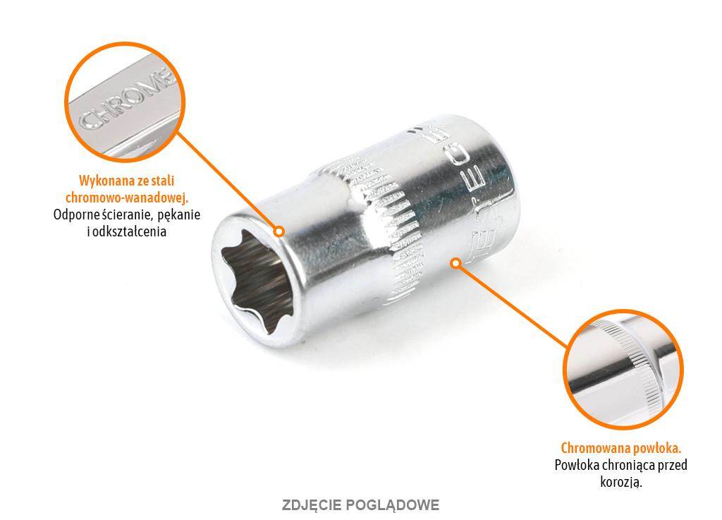 Klucz nasadowy 1/4″ torx e10 / teger nasadka przeznaczona do odkręcania i dokręcania śrub i nakrętek typu torx. Wykonana ze stopu stali chromowo-wanadowej crv, wytrzymałej na naprężenie statyczne i kinetyczne. Wysoka jakość wykonania, trwałość i niezawodność w każdych warunkach, unikalna, polerowana powłoka na powierzchni klucza znacząco zwiększa komfort pracy oraz pozwala na utrzymanie narzędzi w czystości.