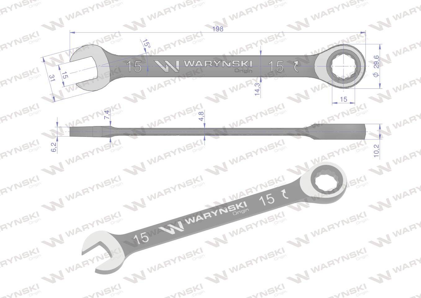 Klucz płasko-oczkowy 15mm z grzechotką 72 zęby standard asme b107-2010 waryński