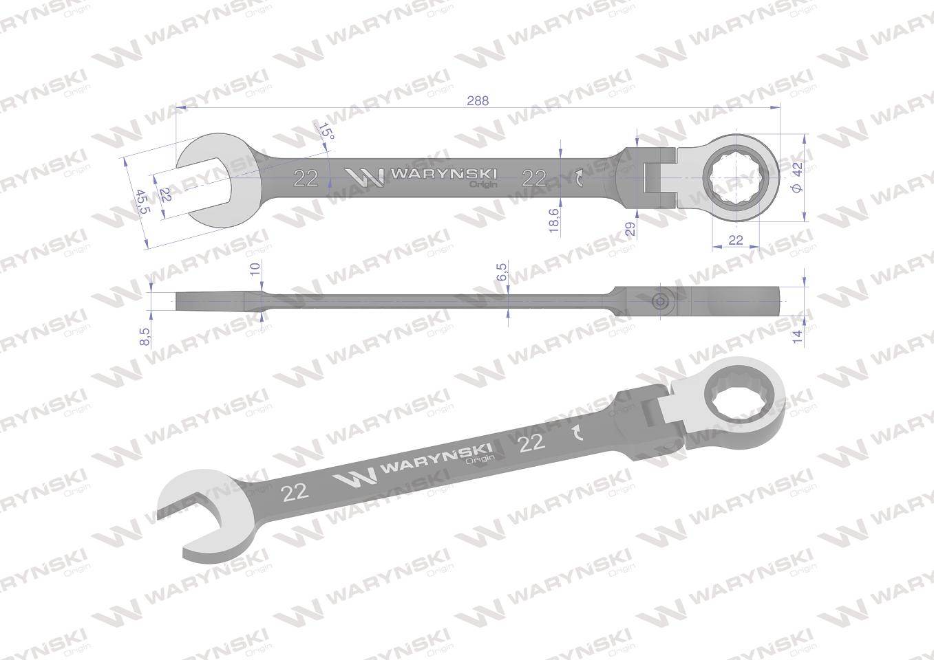 Klucz płasko-oczkowy 22mm z grzechotką 72 zęby i przegubem waryński