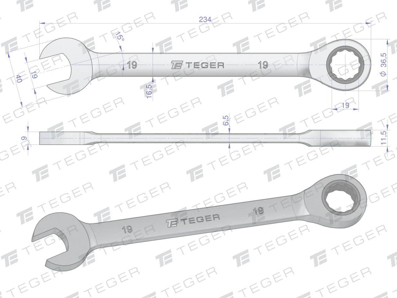 Klucz płasko-oczkowy z grzechotką 19mm teger