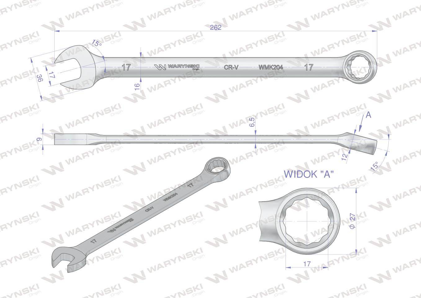Klucz płaskooczkowy extra długi 17mm dł 262mm standard asme b107.9m waryński