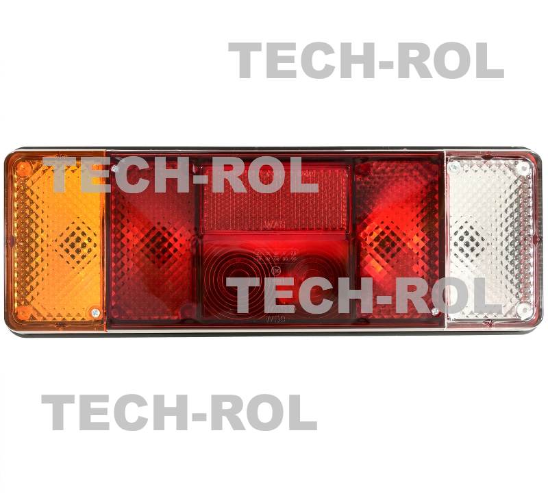 Lampa zespolona tylna lewa funkcje: stop, pozycja, kierunkowskaz, oświetlenie tablicy, światło przeciwmgielne, światło cofania. Zastosowanie samochodach i przyczepkach samochodowych . Napięcie: 12V/24V.