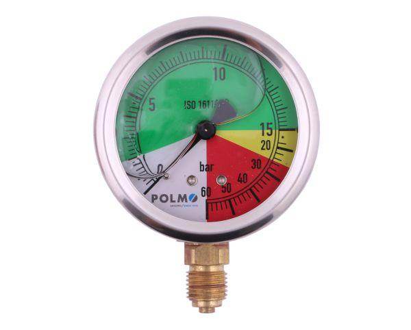 Manometr glicerynowy m63 0-15/60 bar gwint g1/4″ dolne przyłącze, obudowa kwasoodporna, opryskiwacz polmo