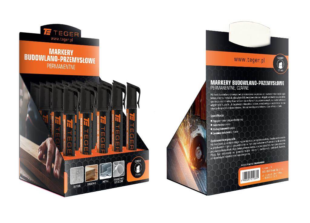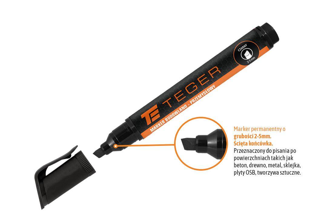 Marker budowlano – przemysłowy – czarny marki teger / przeznaczony do pisania po powierzchniach takich jak beton, drewno, metal, sklejka, płyty osb, tworzywa sztuczne. Wyjątkowo trwały tusz, świetnie sprawdza się w trudnych warunkach budowlanych czy przemysłowych, na powierzchniach wilgotnych, tłustych lub zapylonych. Nasadka z klipem, umożliwiająca zaczepienie np. na smyczy do spodni lub kombinezonu. Nie zawiera ksylenu i toluenu. Czas schnięcia 3 sek,