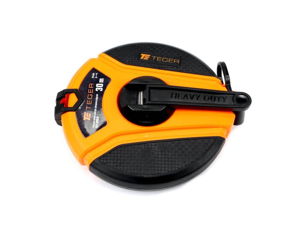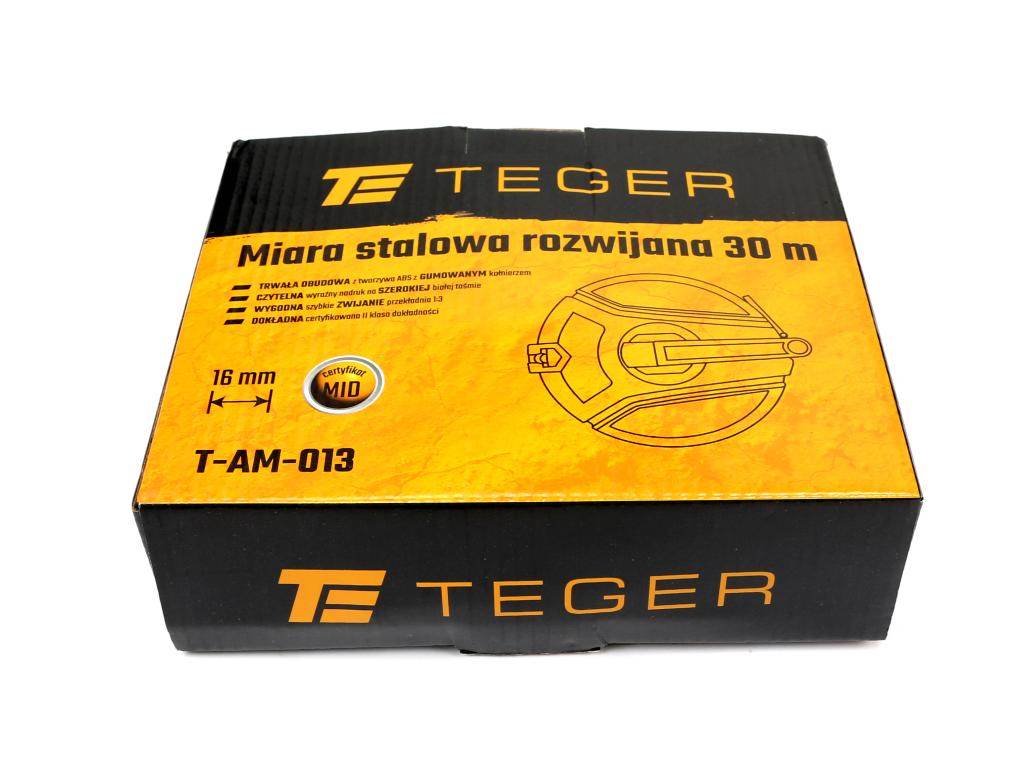 Miara rozwijana stalowa teger długość 30m w obudowie z odpornego na uszkodzenia tworzywa abs z gumowanymi wstawkami wykonana zgodnie z normami obowiązującymi przy dyrektywie ce (mid) iii klasy dokładności z opatentowaną przekładnią 1:3 zwiększająca szybkość zwijania