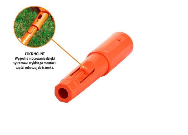 Mocowanie trzonka click / teger / to element wymienny do trzonka z systemem click. Wykonane z wytrzymałego i elastycznego tworzywa. System click z wymiennymi głowicami pozwala na wydajną pracę i ułatwia utrzymanie porządku wśród narzędzi ogrodniczych. Szeroki wachlarz wymiennych głowic pozwala dobrać odpowiednie narzędzie do danej czynności.