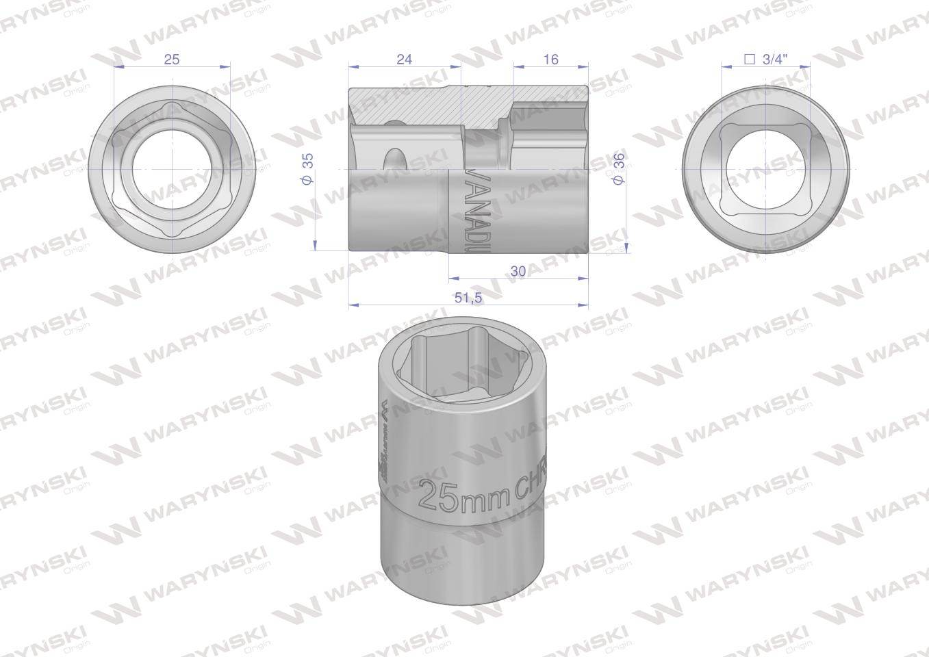 Nasadka sześciokątna 3/4" 25mm crv50bv30 din 3124 waryński