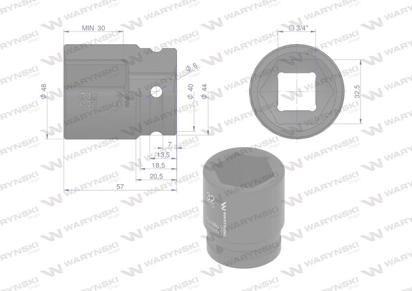 Nasadka udarowa sześciokątna 3/4″ 32mm crmo din 3129 waryński