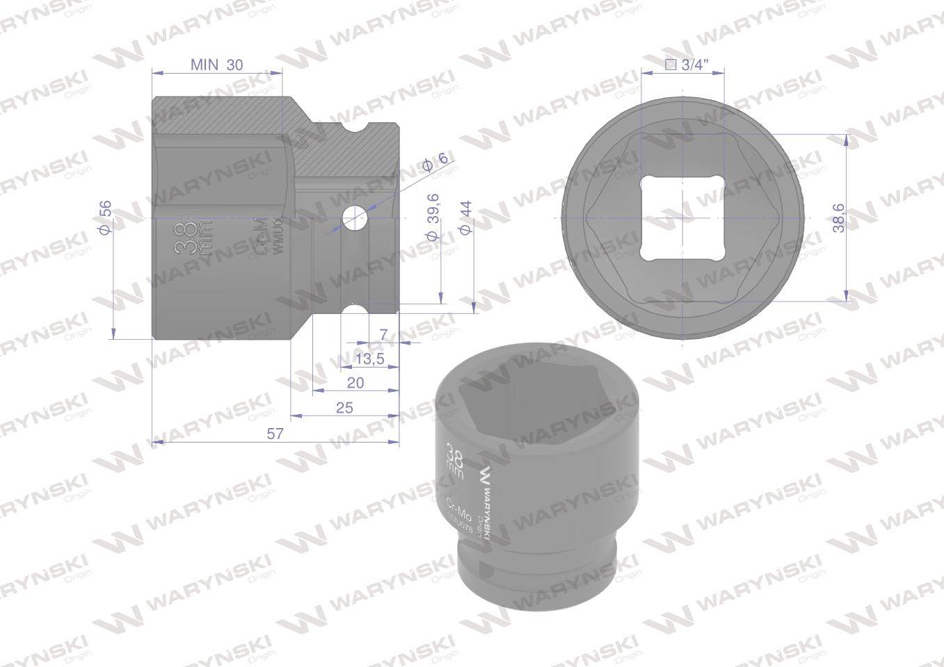 Nasadka udarowa sześciokątna 3/4″. 38 mm. Crmo. Din 3129. Waryński