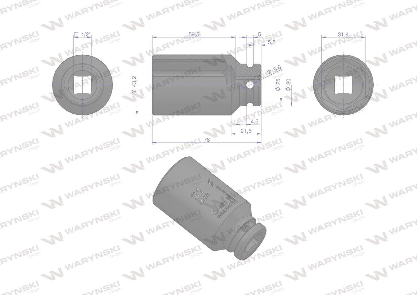 Nasadka udarowa sześciokątna długa 1/2" 31mm crmo din 3129 waryński