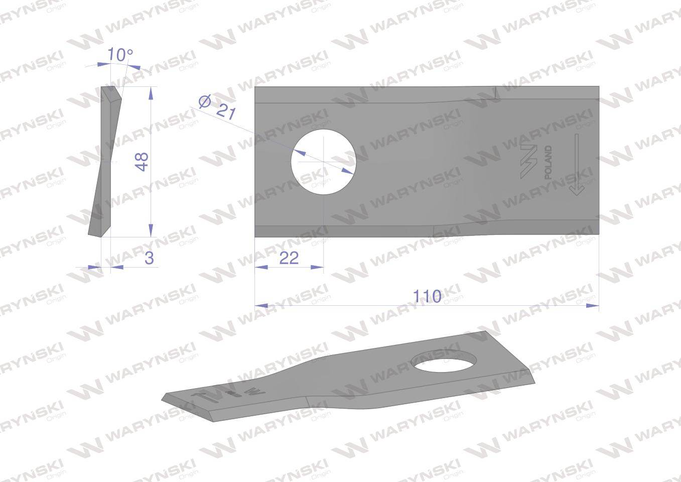 Nóż nożyk kosiarka prawy 110x48x3mm otwór 21 108p galfre waryński 25szt