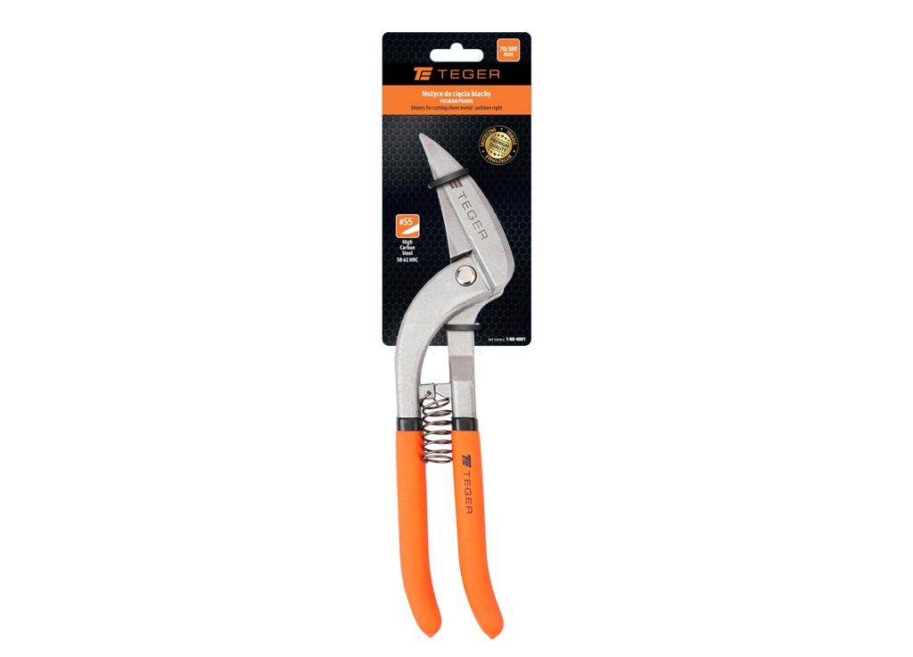 Nożyce do cięcia blachy – pelikan prawe / teger przeznaczone do cięcia blachy głównie podczas pracach blacharskich i dekarskich. Kute, hartowane szczęki wykonane z wysokogatunkowej stali narzędziowej (high carbon steel) są wyjątkowo odporne na ścieranie pękanie i odkształcenia, dodatkowo zabezpieczone powłoką ptfe. Antypoślizgowa rękojeść powlekana z tworzywa sztucznego.
