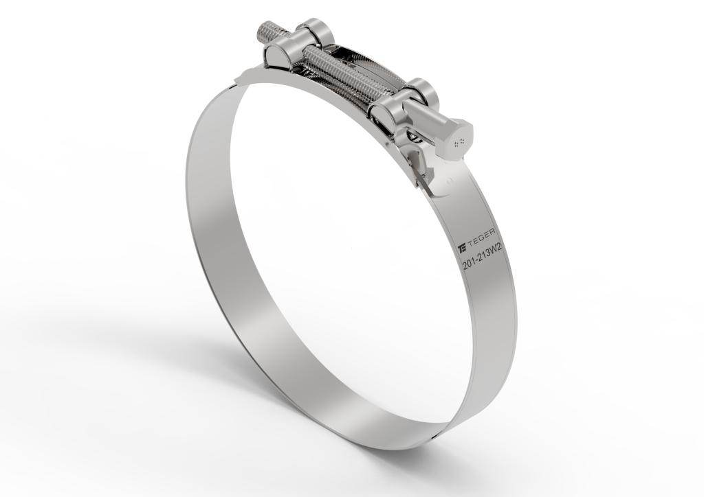 Opaska zaciskowa gbs 201-213 skręcana wzmacniana (obejma w2 – stal nierdzewna) szerkość 26mm teger. Skręcane śrubą z łbem sześciokątnym oraz dwoma sworzniami wewnętrznymi pełnymi. Dzięki czemu charakteryzują się zwiększoną siłą zacisku. Opaski zaciskowe gbs – łatwe w montażu: kluczyk, trwałe, duża siła zaciskająca.