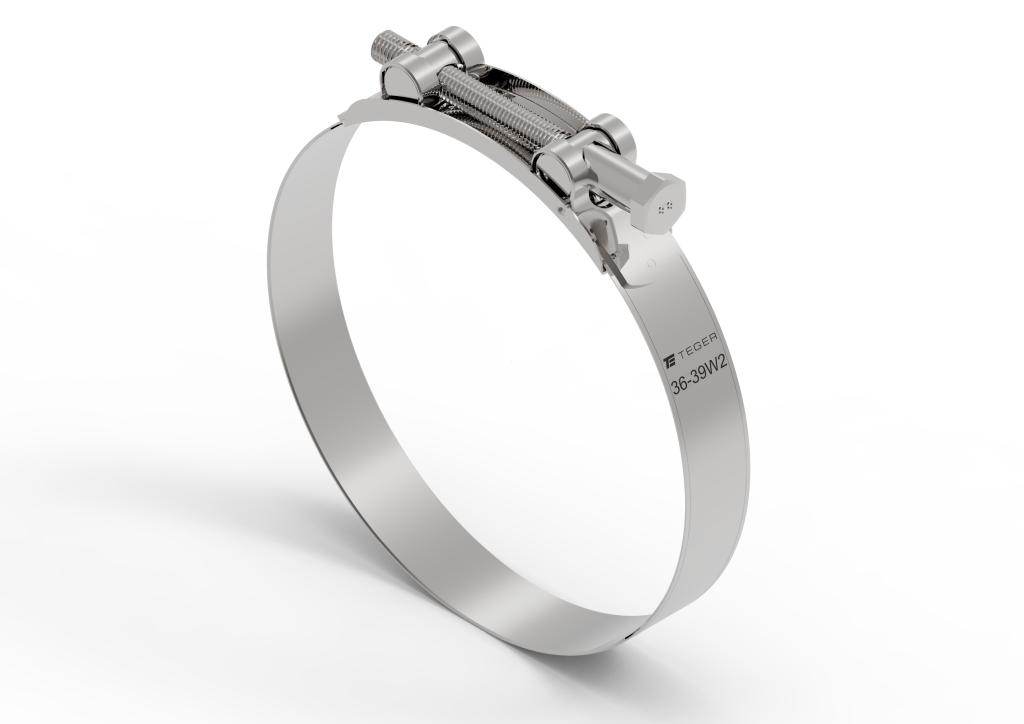Opaska zaciskowa gbs 36-39 skręcana wzmacniana (obejma w2 – stal nierdzewna) szerkość 20mm teger. Skręcane śrubą z łbem sześciokątnym oraz dwoma sworzniami wewnętrznymi pełnymi. Dzięki czemu charakteryzują się zwiększoną siłą zacisku. Opaski zaciskowe gbs – łatwe w montażu: kluczyk, trwałe, duża siła zaciskająca.