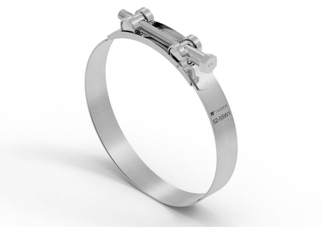 Opaska zaciskowa gbs 52-55 skręcana (obejma w1 – stal ocynkowana) szerkość 22mm teger. Skręcane śrubą z łbem sześciokątnym oraz dwoma sworzniami wewnętrznymi pełnymi. Dzięki czemu charakteryzują się zwiększoną siłą zacisku. Opaski zaciskowe gbs – łatwe w montażu: kluczyk, trwałe, duża siła zaciskająca.