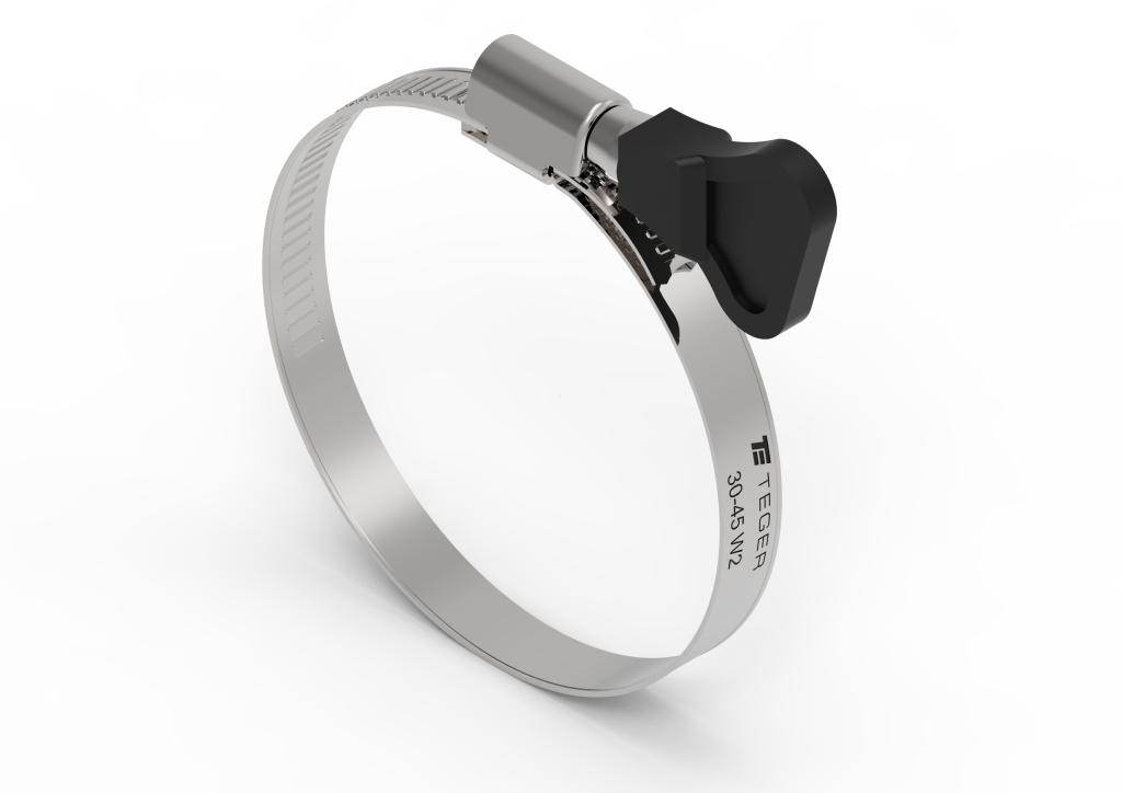 Opaska zaciskowa z pokrętłem 30-45 ślimakowa skręcana (obejma w2 – stal nierdzewna) szerkość 9mm teger. Opaski zaciskowe ślimakowe – łatwe w montażu: śrubokręt lub kluczyk, trwałe, duża siła zaciskająca. Metalowa obejma ślimakowa posiada pokrętło (klucz, motylek), który sprawia, że nie potrzebujemy żadnych dodatkowych narzędzi: kluczy, ani wkrętaków do zaciśnięcia. Spakowane w plastikowy zbiorczy blister z etykietą i otworem – służącym do zawieszenia na regał ekspozycyjno-sprzedażowy.