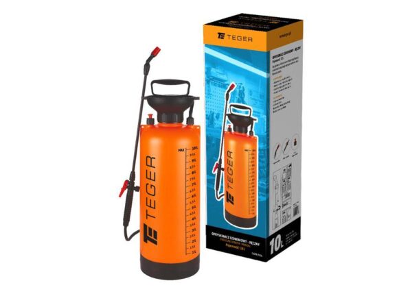 Opryskiwacz ciśnieniowy teger o pojemności zbiornika 10l.doskonale nadaje się do pracy w domu i ogrodzie. Idealny do zraszania i nawożenia roślin doniczkowych, a także do oprysku drzew i krzewów.opryskiwacz ciśnieniowy teger posiada:-dyszę rozpylającą z możliwością regulacji w pełnym zakresie-blokadę umożliwiającą stałą pracę bez konieczności trzymania przycisku spustu-pojemnik z wytrzymałego tworzywa sztucznego z nadrukowaną praktyczną skalą pojemności-pasek na ramię z możliwością regulacji-zawór bezpieczeństwa zabezpieczający przed przekroczeniem dopuszczalnego ciśnienia maksymalnego-kołnierz w formie lejka chroniący przed rozlewaniem cieczy podczas napełniania.