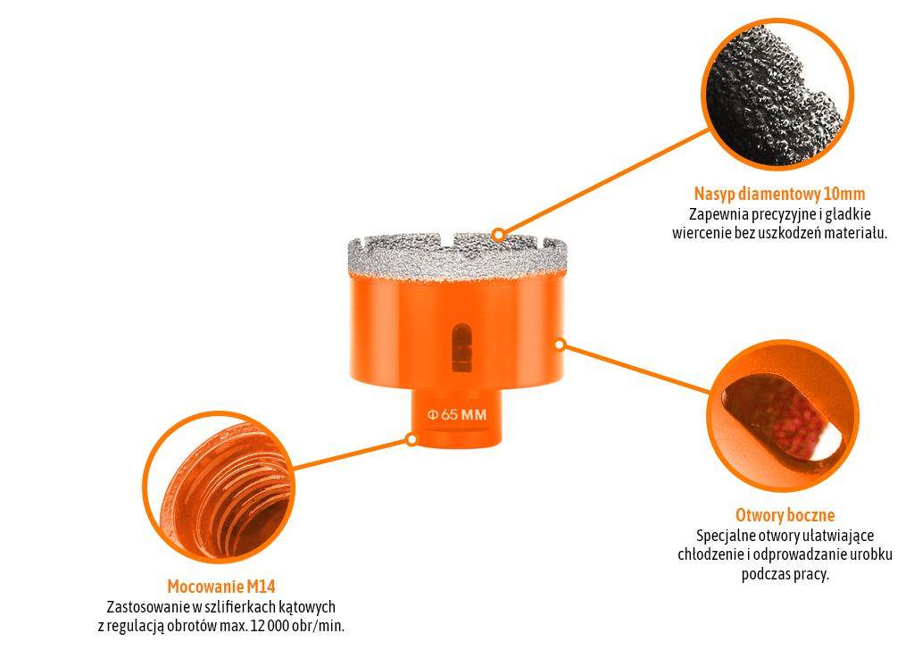 Otwornica diamentowa z uchwytem m14/65 mm / teger przeznaczone do wykonywania otworów przy zastosowaniu szlifierki kontowej głównie w twardych materiałach, takich jak: marmur, granit, gres, ceramika, beton, kamień. Metalowy korpus wykonany z wysokogatunkowej stali węglowej z drobnym i gęsto zespolonym nasypem diamentowym, lutowanym próżniowo gwarantuje szybkie i precyzyjne cięcie. Przeznaczona do pracy na sucho – zaleca się chłodzenie otwornicy powietrzem co 1 minutę poprzez pozostawienia szlifierki na biegu jałowym przez ok 30 sekund. Precyzyjny uchwyt m14 umożliwia szybki montaż na szlifierce, alternatywnie do pracy można użyć wiertarki bądź wkrętarki przy zastosowaniu specjalnego adaptera m14 hex 3/8″ – indeks: t-nb-ada-001 teger