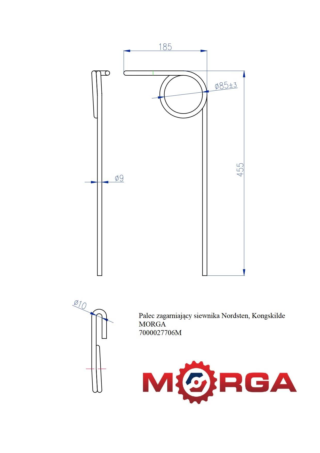 Palec zagarniający siewnika Nordsten, Kongskilde malowany proszkowo MORGA