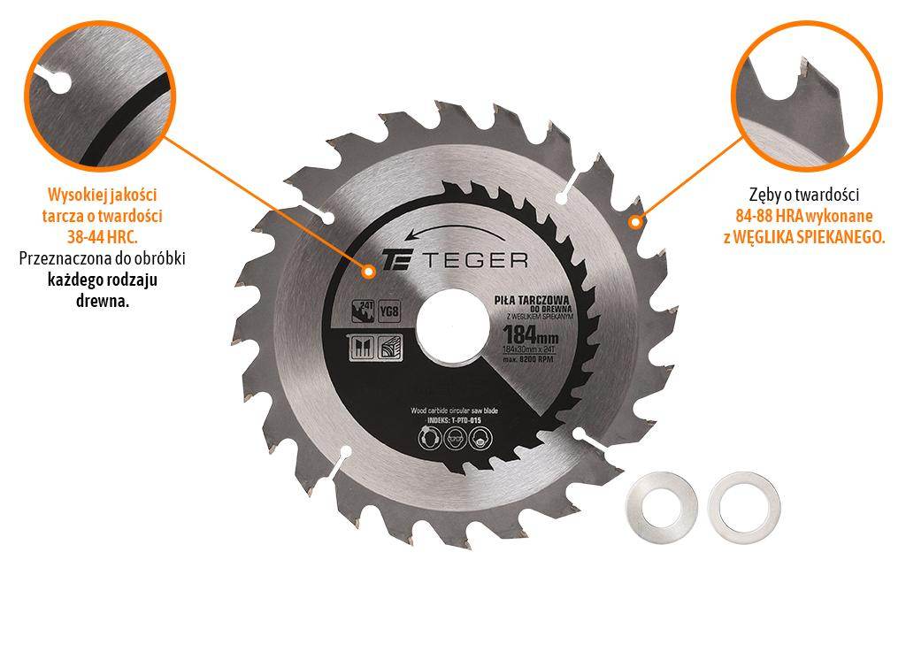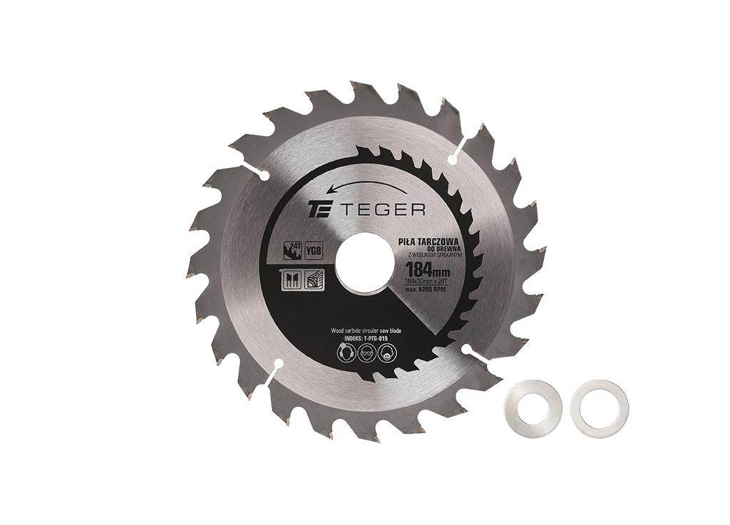 Piła tarczowa do drewna z węglikiem spiekanym 184x30x24t / teger przeznaczona do cięcia wzdłużnego i poprzecznego drewna litego, sklejki, płyt wiórowych, płyt laminowanych i mdf, materiałów drewnopodobnych i kompozytowych. Zęby widiowe z węglikiem spiekanym zapewnia długą żywotność tarczy przy intensywnej pracy.